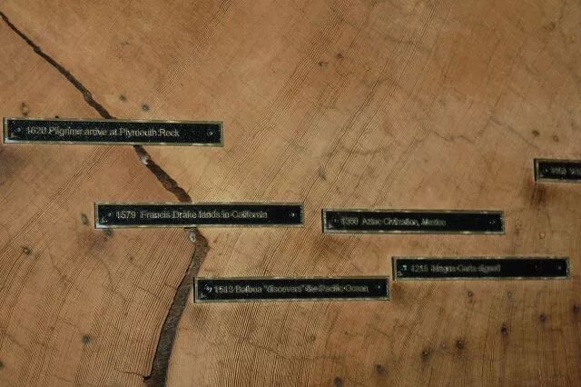 一段北美红杉的木材的截面,从1215年大宪章的订立、1513年巴尔沃亚发现太平洋、1579年德雷克抵达加利福尼亚,到1620年朝圣先辈们抵达普利茅斯殖民地,一系列知名时间节点被标注在这一圈圈的年轮上。