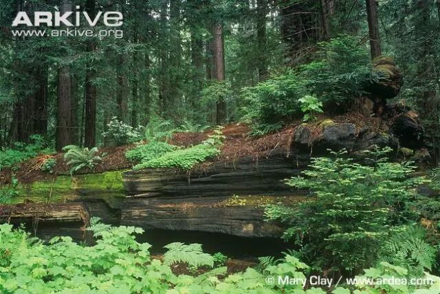 原生的北美红杉林下也绝非空旷无趣,除去伴生的美西黄杉、西部铁杉(Tsuga heterophylla)、巨冷杉(Abies grandis)等巨树之外,几乎每一棵北美红杉上都能找到大量附生的越橘和蕨类,太平洋四照花和杜鹃在林中绽放。落叶提供了极厚的腐殖质层,适应于弱光的酢浆草、猪牙花、延龄草、舞鹤草,与真菌提供营养的腐生植物都在林下常见。这里也同时是无数无脊椎动物、蝾螈、斑林鸮、斑海雀和美洲黑熊的家。