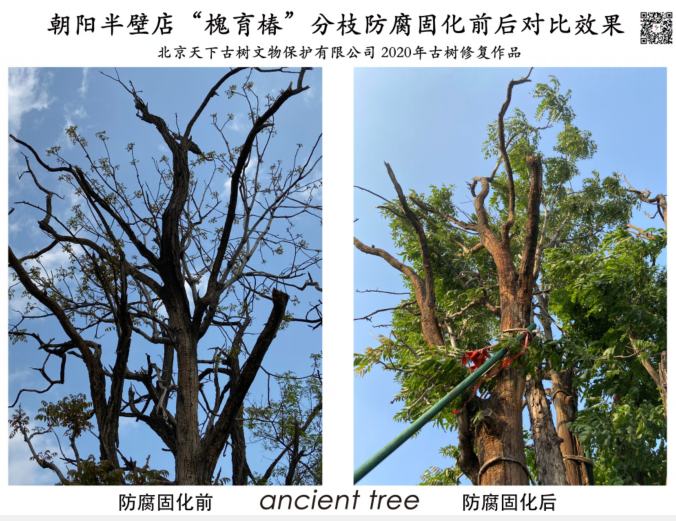 经过科学的预处理后(相当于局部“备皮”),对刺槐树整树开展了一次隐形的膜结构修复,这样就可以在雨季来临后,整树木质部不再继续糟朽腐烂、不再因为继续脱水最终危及到仅有的一点活体部分,鉴于椿树和刺槐的相互依存的关系,刺槐的树体保护在一定程度就是保护老椿树,因从结构上看刺槐在事实上的支撑效果会直接影响了椿树的树杆和树冠。为了兼顾顾两株老树盘根错节的根系,采取了相对折中的复壮办法去促进两株老树未来树势的恢复。